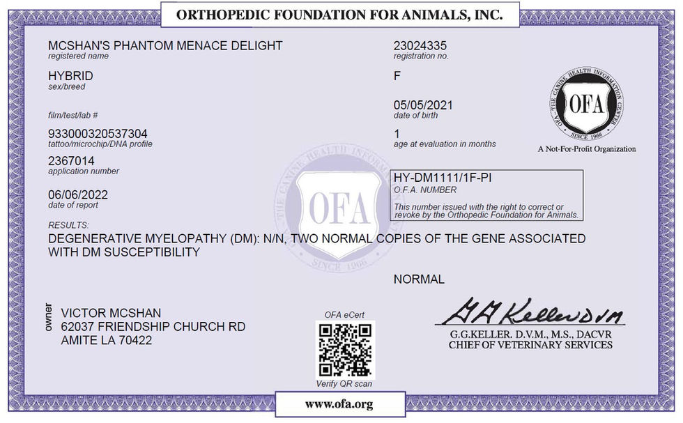 These certifications are verification that this dogs genetic clearances are authenticated by Orthopedic Foundation for Animals.
