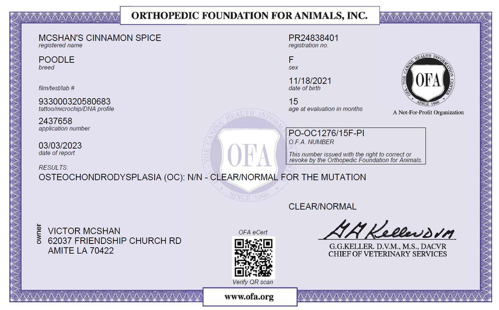 These certifications are verification that this dogs genetic clearances are authenticated by Orthopedic Foundation for Animals.
